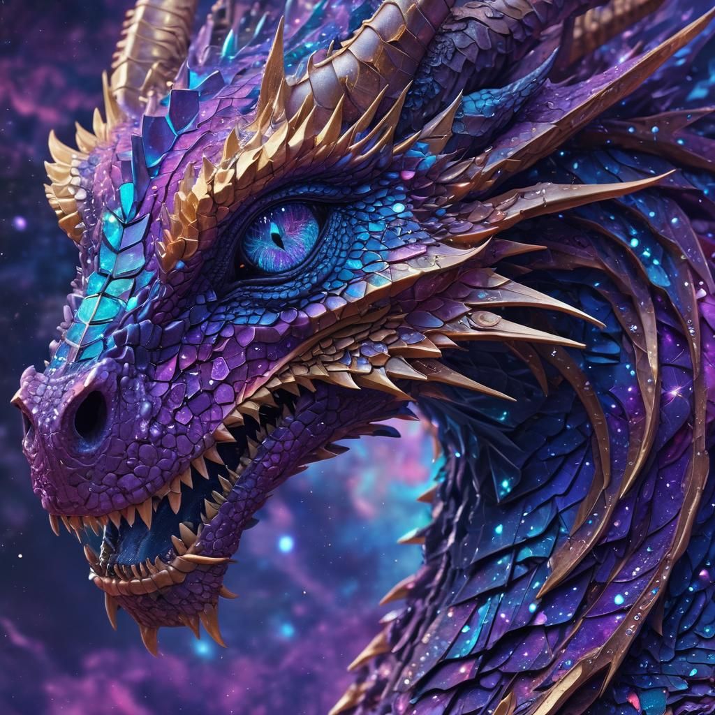 A striking picture of a cosmic dragon in space, radiating colorful energy. This artwork features holographic, astral elements with sparkling stars and diamonds, rendered in vibrant colors as digital art.