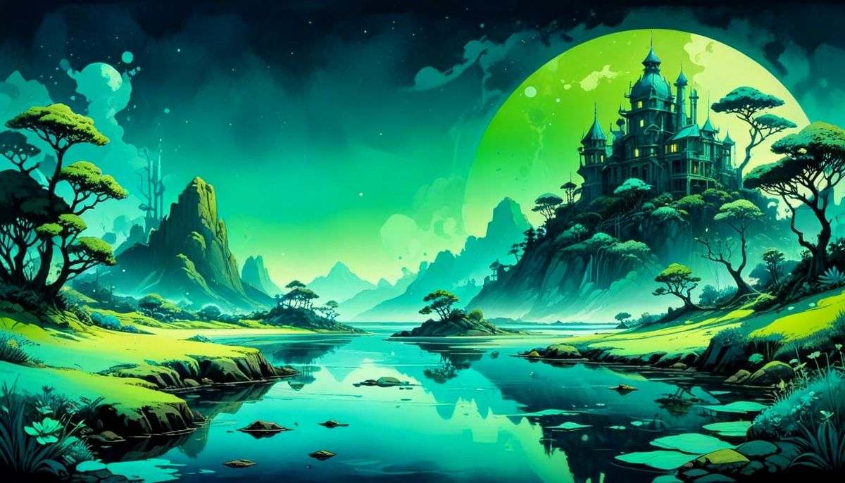 A vibrant, maximalist cyanotype landscape image. The color palette features turquoise, teal, and lime green hues, with bioluminescent elements creating an ethereal aesthetic.