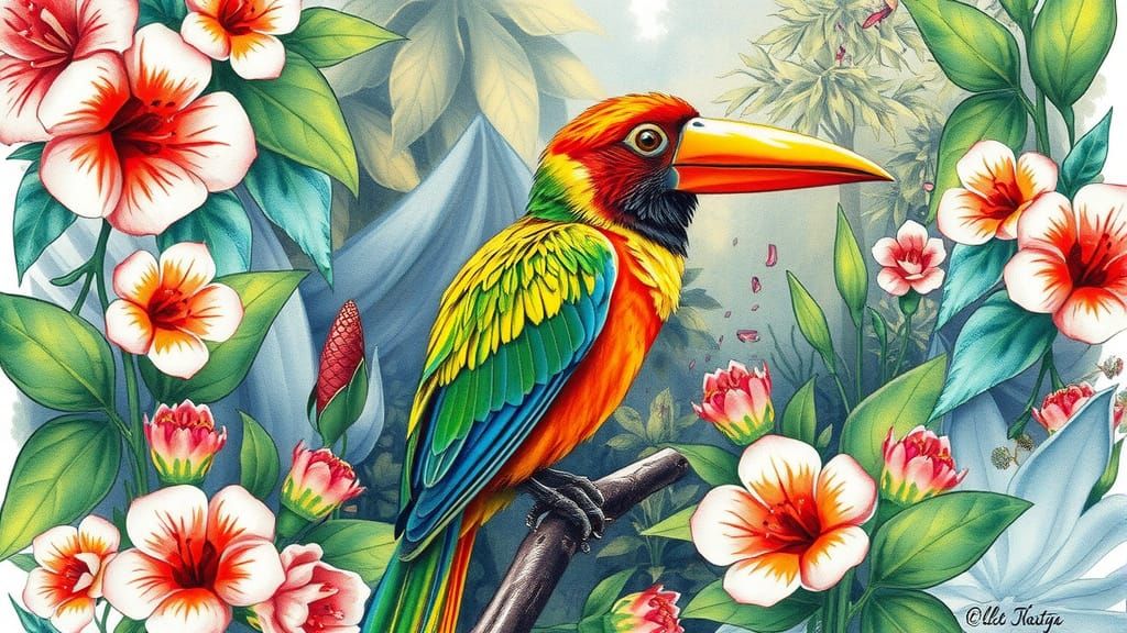 This image shows a colorful exotic bird perched in a vibrant natural environment. The artwork features detailed watercolor and pencil sketch elements, with layered textures and bold brushstrokes.