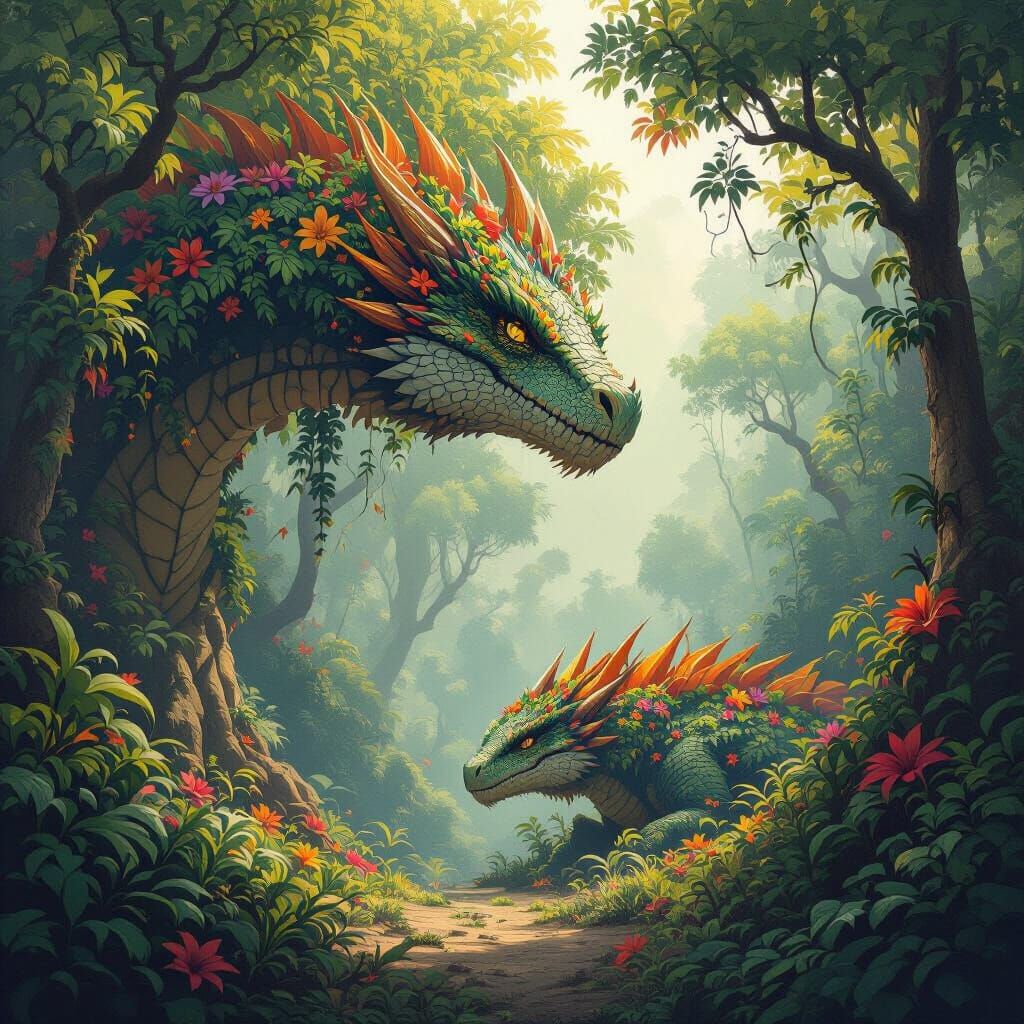 A vivid image of a lush forest featuring colossal trees adorned with vibrant flowers and exotic fruits. A majestic dragon is in the foreground, rendered with soft shading and realistic details in an organic style.