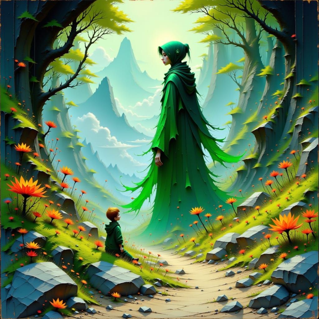 This image shows an ancient spirit draped in green robes shaping vibrant landscapes. The scene is rendered with soft, ethereal lighting and intricate textures, in a style reminiscent of digital surrealism.