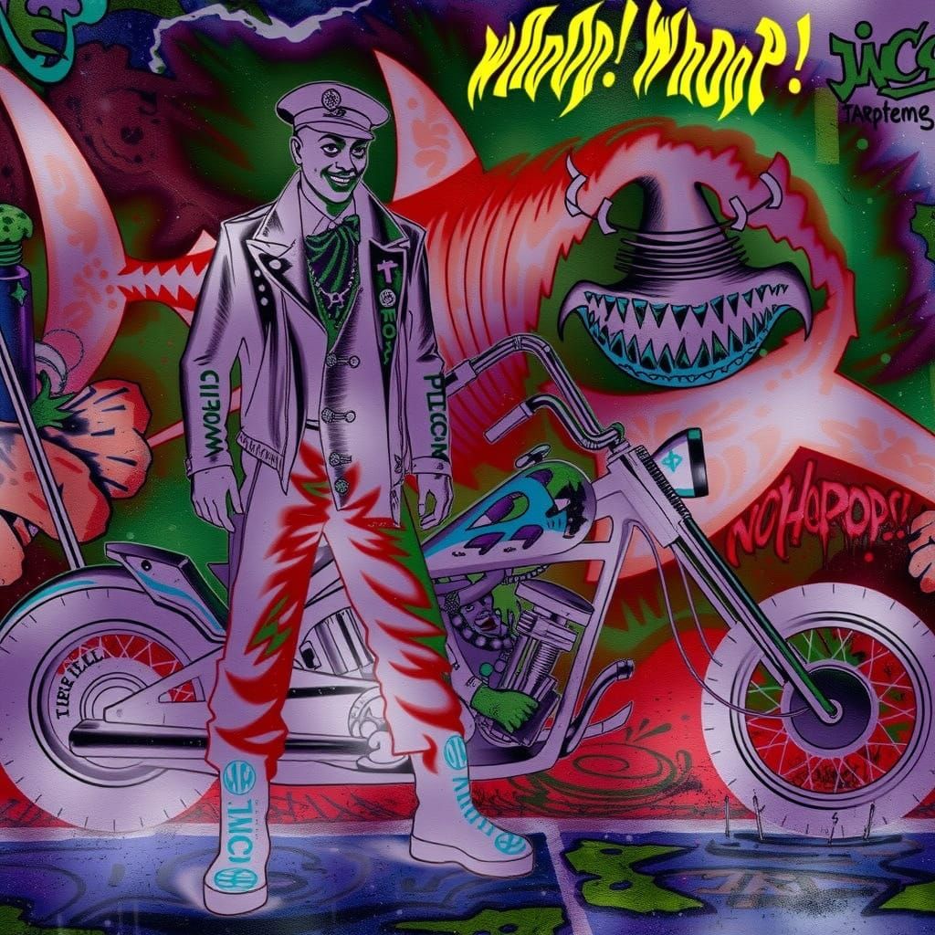 This image shows a vibrant splash art piece featuring an ICP Juggalo, complete with graffiti art that reads 'whoop! whoop!' The artwork is rendered with dynamic energy.