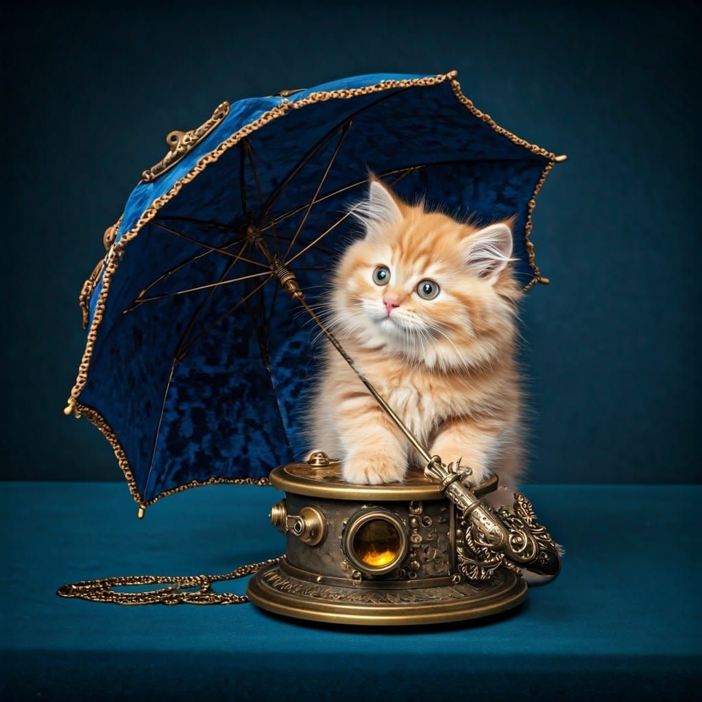 A charming image of an orange kitten sheltered under a steampunk-style umbrella. The umbrella features intricate brass and copper detailing, velvet accents, and ornate, symmetrical designs.