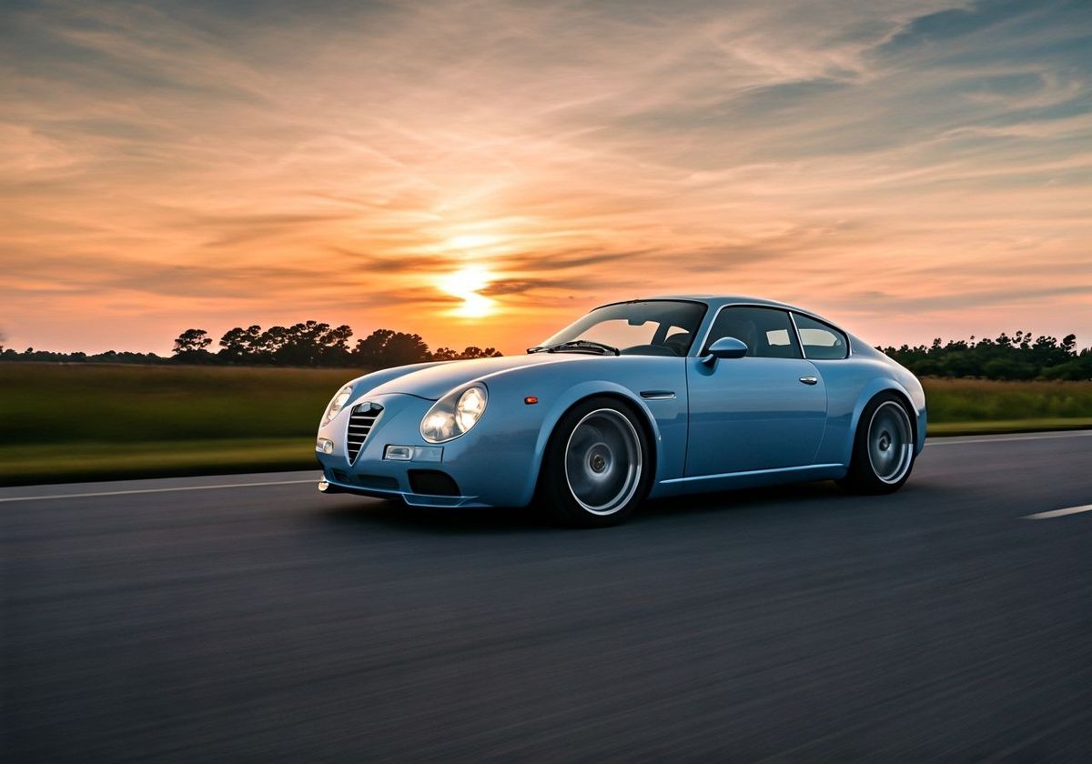 This cinematic image captures a light blue Alfa Romeo Zagato concept car driving through an Everglades sunset. Features film grain and dramatic lighting for a stunning, atmospheric masterpiece.