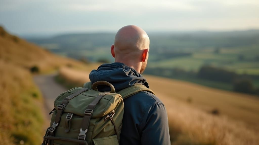 This image captures a bald man in hiking gear, surrounded by the scenic rolling hills of Kent, England, in a high-contrast, professionally styled photograph.