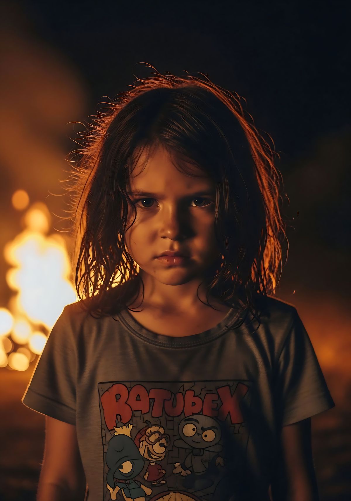 This totally gives off Stephen King’s Firestarter vibes 🔥🧠 The kid looks like she’s controlling the flames with pure willpower. That intense stare mixed with the cartoon shirt is such a powerful contrast. Amazing shot! 🔥🖤