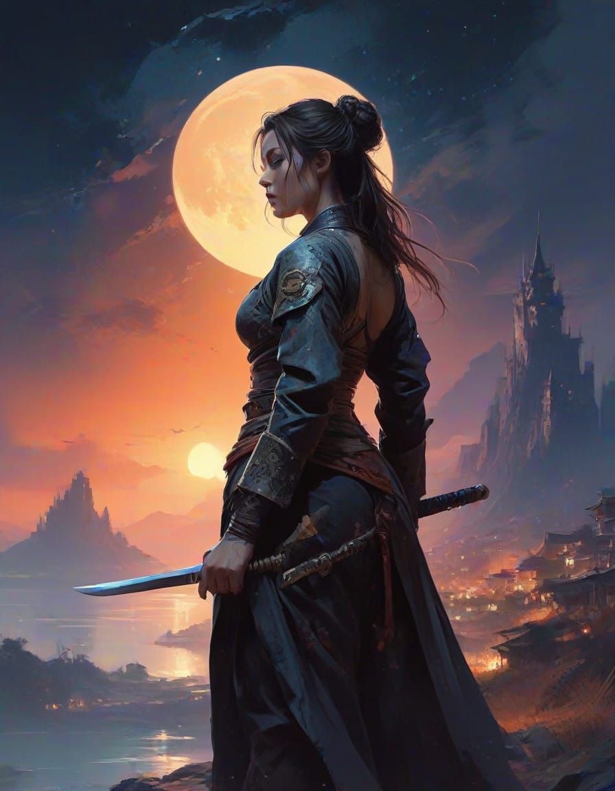 This striking image depicts a powerful female samurai standing triumphantly amidst a vibrant, cosmic night sky. With her sword raised high, she embodies strength and bravery in a world of wonder and adventure.