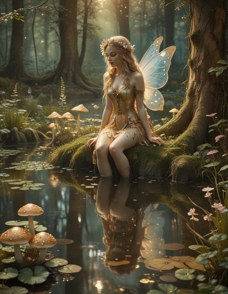 This image showcases a wood nymph beside a pond, surrounded by glowing mushrooms and flower petals. The scene is set in a misty forest with warm golden light, creating a serene and mystical atmosphere.
