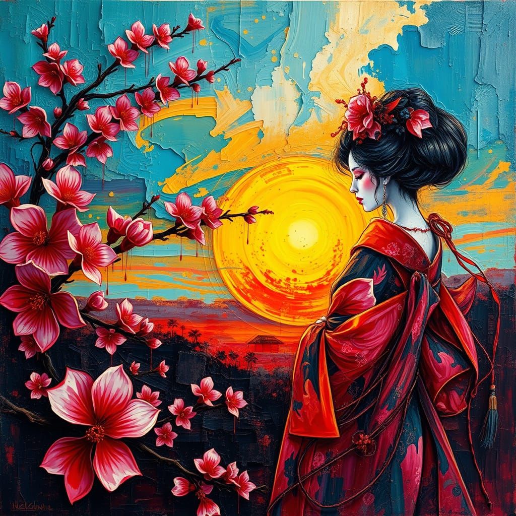 This painting captures a dynamic geisha amidst a vibrant blossom sunset, with thick, heavy impasto layers and bold brushstrokes, creating a tactile, three-dimensional quality that invites the viewer to touch.