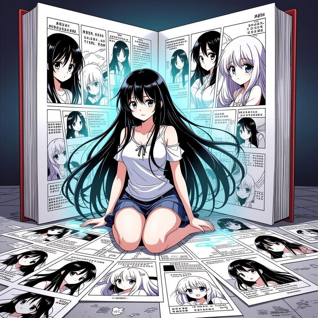 This image depicts a manga-style woman with long black hair emerging from a colossal comic book, surrounded by scattered panels on the floor.