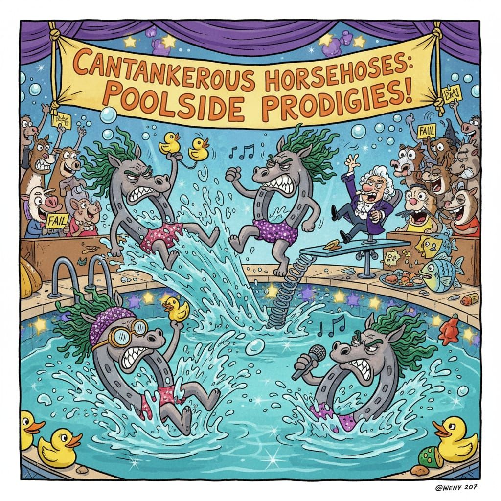 This image features a wild and funny illustration of cantankerous horseshoes participating in a talent show, showcasing a unique and comical scene.