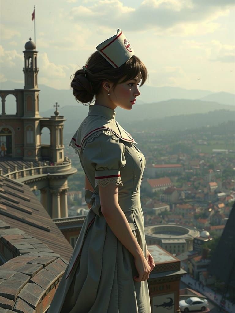 This image shows a poignant moment of farewell between a refined English nurse and a loved one, set against a warm Italian sunset. The nurse's elegant uniform and delicate features evoke a sense of nostalgia and romance, blending 3D anime art with realistic detail and whimsical charm.