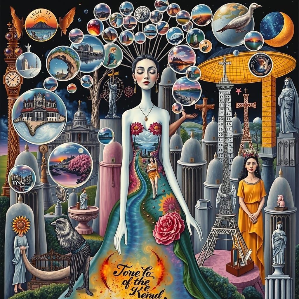 A surreal portrait of a woman with bubbles for hair, each containing tiny landscapes. The artwork features dreamlike realism and mystical symbolism in rich, bold colors.