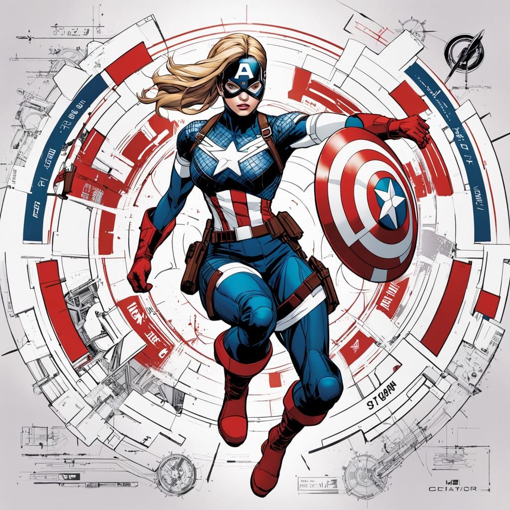 A dynamic image of Sharon Carter transforming into Captain America. She holds the iconic shield in a heroic pose, wearing a modern, armored version of the classic red, white, and blue suit against a blueprint background.