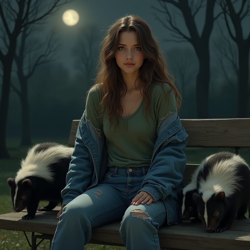 This serene image captures a woman sitting on a weathered park bench at midnight, surrounded by the soft glow of the deserted park and curious skunks, evoking a dreamlike atmosphere reminiscent of Beatrix Potter's whimsy and Joel Peter Witkin's moody lighting.