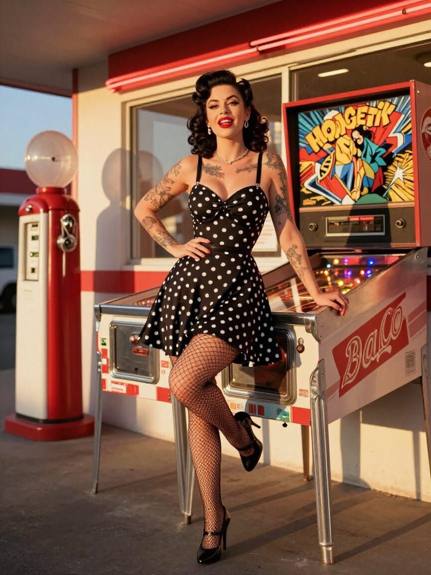 A vibrant 1950s rockabilly pin-up woman in a polka dot dress poses at a retro gas station, with a glowing pinball machine. Captured in warm golden hour light with a comic art influence.