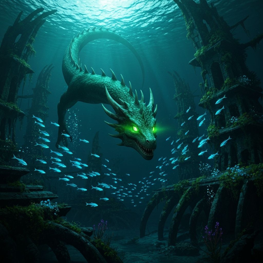 This image shows a bioluminescent dragon coiled around the ruins of a sunken alien city. Schools of neon fish dart through the skeletal structures in this digital artwork with intricate details.