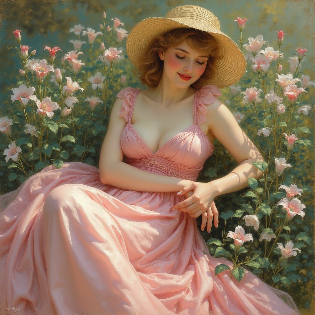 This image shows an elegant woman sitting in a whimsical garden surrounded by blooming flowers and soft pastel colors, evoking the delicate details and dreamy quality of Art Nouveau and Impressionist styles.