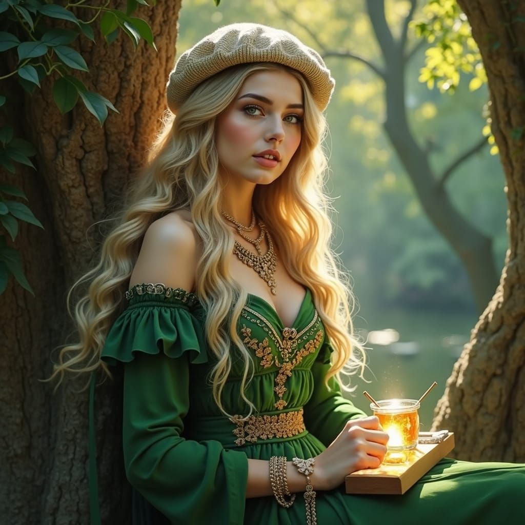 A portrait of a young woman with curly hair painting a self-portrait. This image evokes the style of art nouveau with surrealist and symbolic elements, rendered in soft colors.