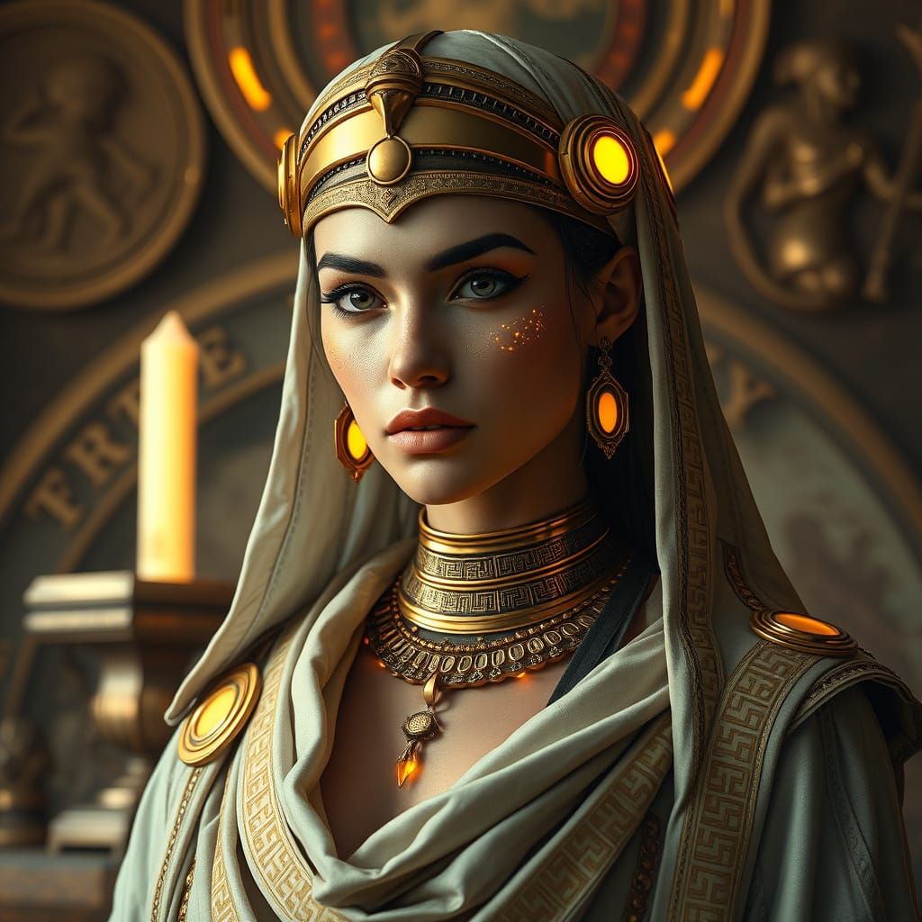 She stands where time folds — a living echo of Mesopotamian royalty reborn in the modern world. Draped in shimmering fabrics of the future and crowned with ancient gold, she wears her heritage like starlight. Glowing cuneiform pulses along her skin, a language forgotten by time but never by power. Surrounded by contemporary art and the relics of her civilization, she is both history and prophecy — the bridge between creation’s dawn and tomorrow’s design.