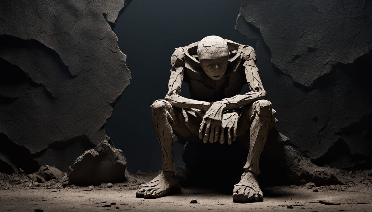 This image shows a primitive sculpture of a solitary, faceless figure crafted from cracked river clay, wood, and rusted nails. The artwork, in an outsider art style, evokes raw emotion and profound isolation.