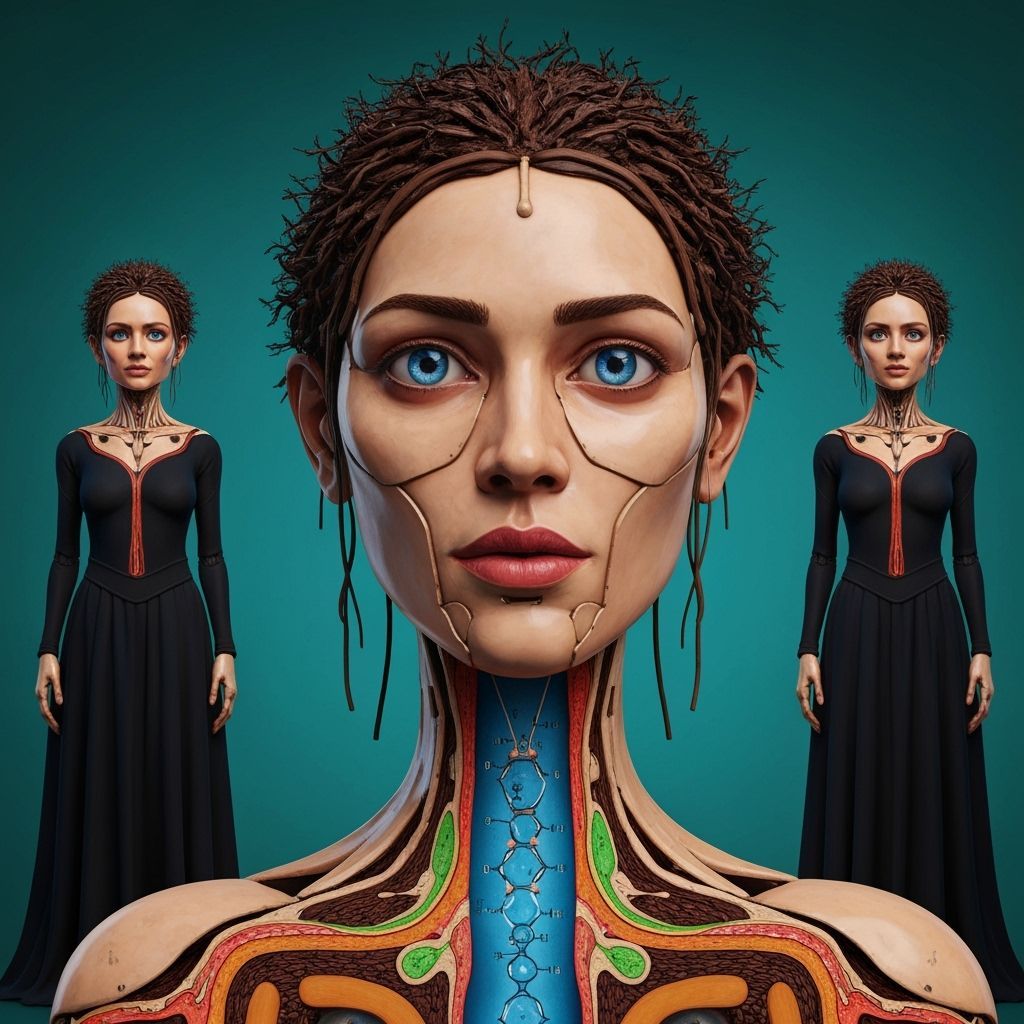 A hyperrealistic portrait of a woman constructed from salvaged materials, featuring liquid moonstone eyes, presented as a 1970s alchemical diagram illuminated by neon light.
