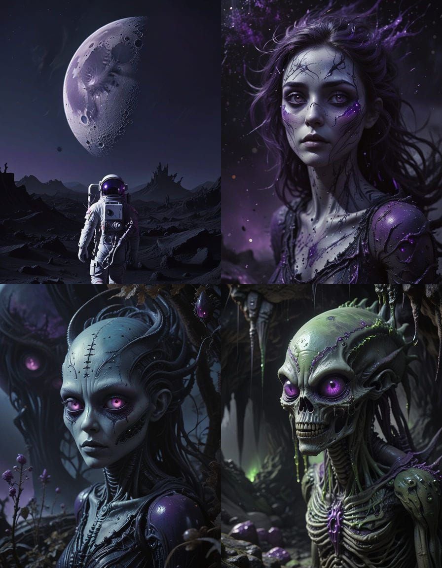 This image showcases a fantastical horror scene set in twilight space, inspired by underground comix and anime styles.