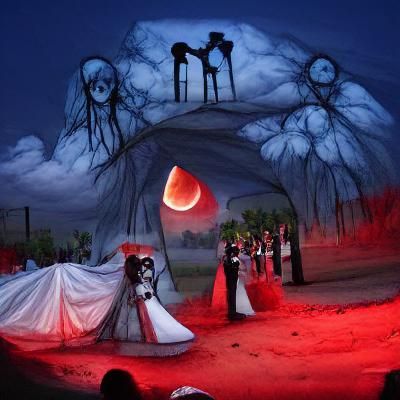 A gothic wedding scene beneath a blood moon. The image evokes a dark and romantic atmosphere, reminiscent of Tim Burton's Corpse Bride, with a focus on macabre beauty.