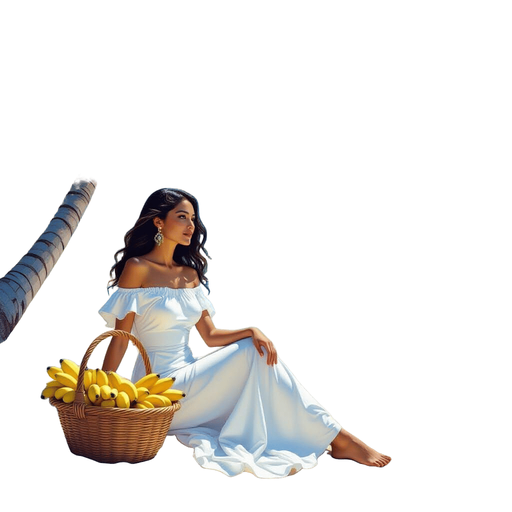 This image shows a woman in a white dress sitting on a beach next to a banana basket. The oil painting style uses bold colors and expressive brushstrokes to create a surreal, spiritual scene.