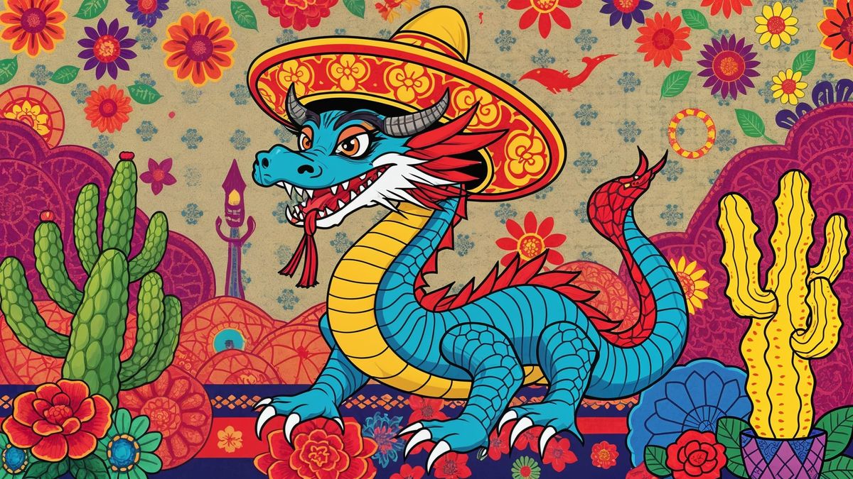 This image shows a whimsical Chinese dragon enjoying a vacation in Mexico. The dragon, with its serpentine body and four legs, is wearing a sombrero for a humorous effect.