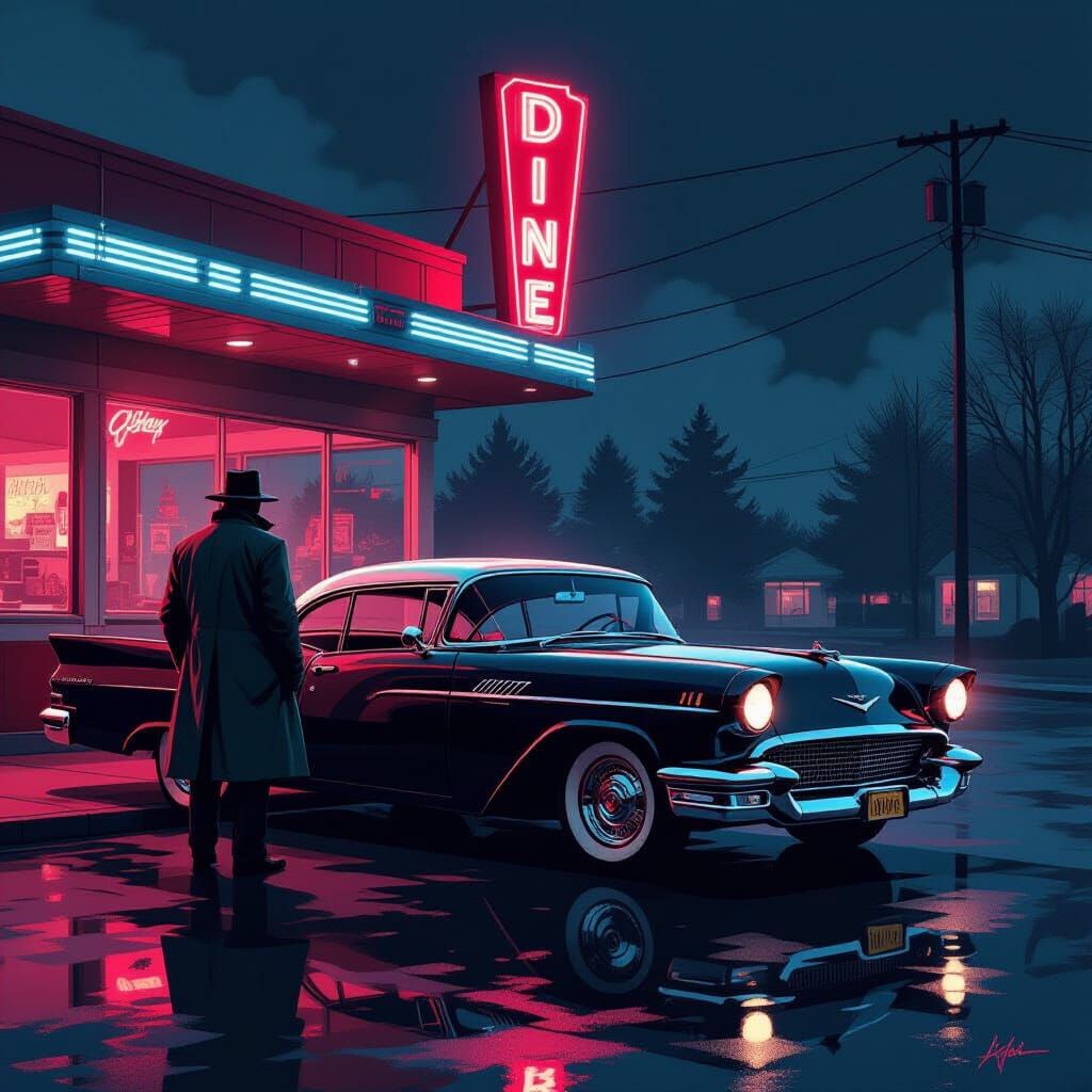 This graphic art style image depicts a vintage 1950s diner with neon signs reflecting on a muscle car. A mysterious figure in the shadows suggests a dark, retro horror theme.