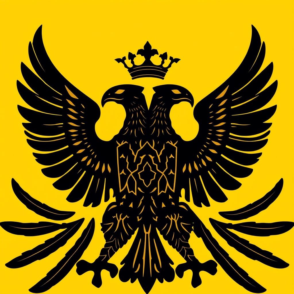 This image is a stylized representation of a two-headed eagle emblem, set against a bright sunshine yellow background, drawing inspiration from Byzantine imperial iconography and the dramatic styles of Russian and Hungarian artists.