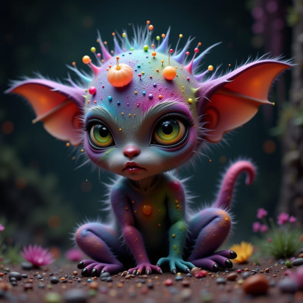 This image shows a sulky, hairy baby monster in time out. The CGI cartoon art features intricate details, complementary colors, and a fantasy concept art style.