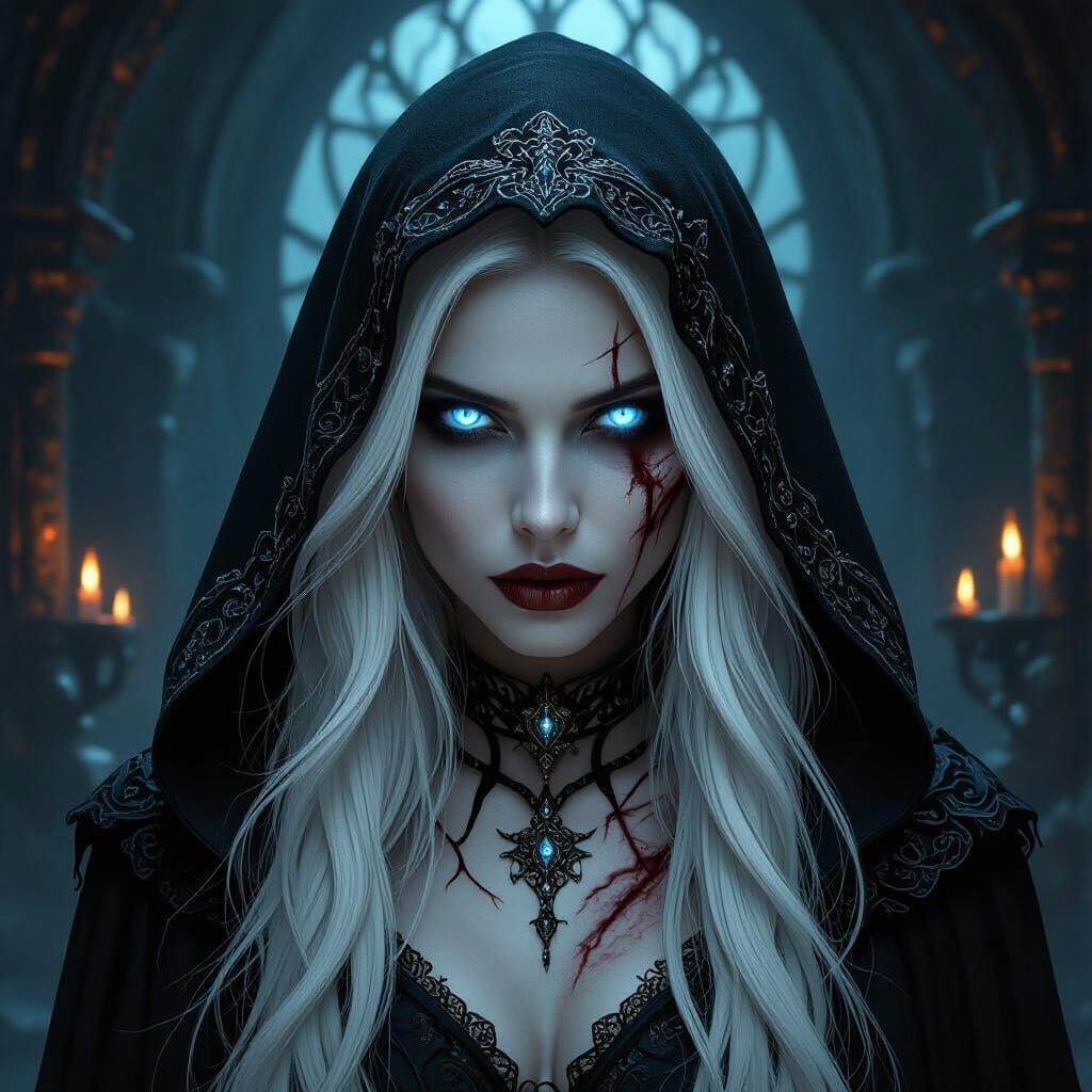 A hauntingly elegant woman with striking contrasts and a chilling aura, depicted in a dark fantasy gothic setting with ethereal digital art and cinematic lighting.
