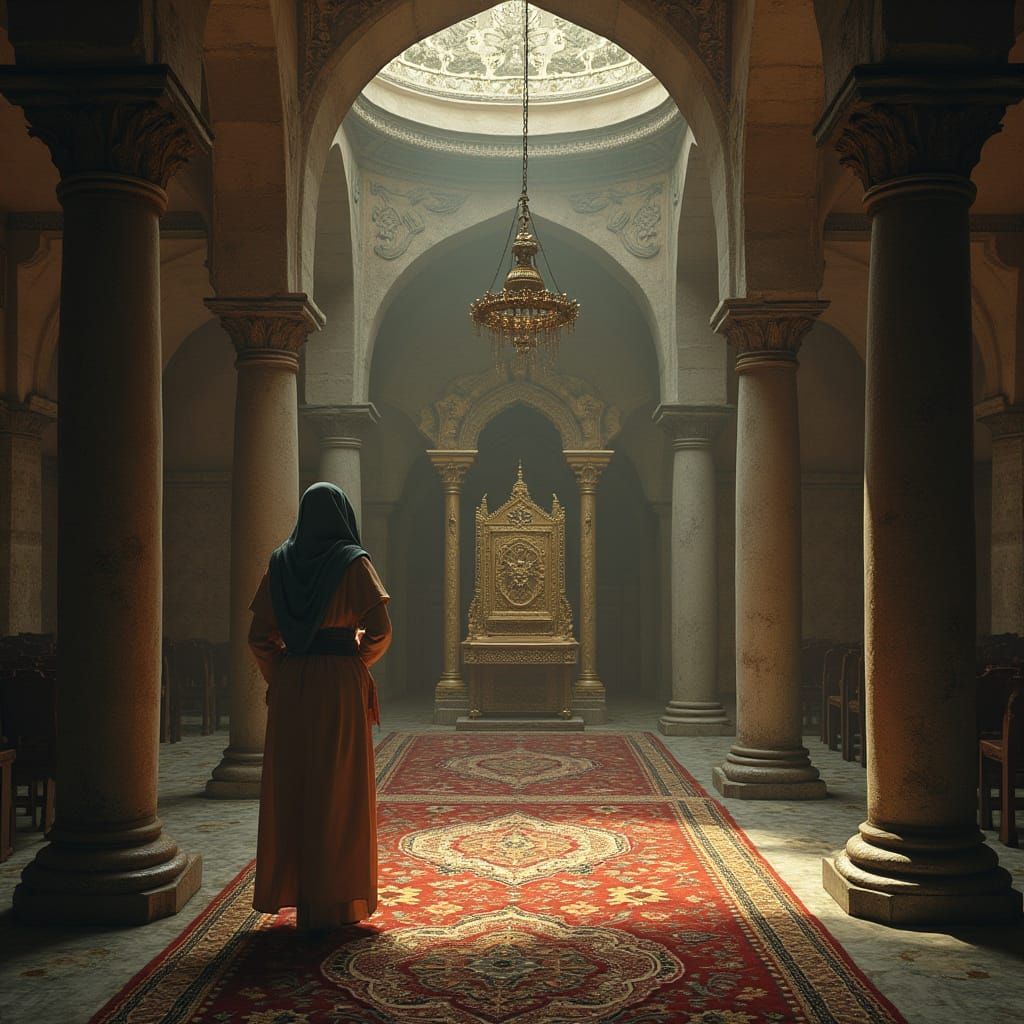 A captivating image of an elderly man in a red velvet kaftan seated on an ornate divan in an opulent room. The scene is illuminated by light streaming through a window, highlighting the room's marble columns and gilded details, rendered as a realistic oil painting.