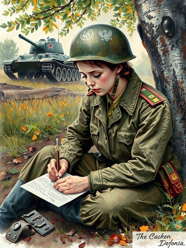 This image shows a girl nurse in a Soviet uniform writing a letter under a house, with a vintage tank blurred in the background. The scene is rendered in a dreamy, surrealistic style with sfumato and watercolor elements, evoking a sense of nostalgia and socialist realism.