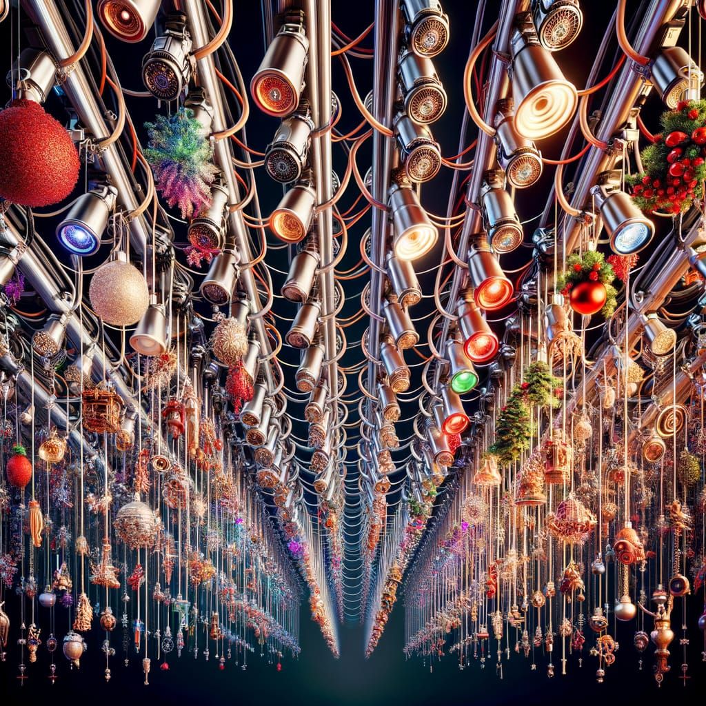 This hyperrealistic image showcases Christmas decorations hanging from a ceiling track lighting system, attached with 3D printed hooks. Features intricate detail and rich color depth.