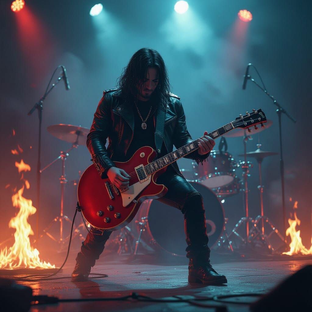 A mesmerizing image of an electric guitar on a stage engulfed in flames, with drums in the background. The artwork features neon lights, smoke effects and a heavy metal aesthetic.