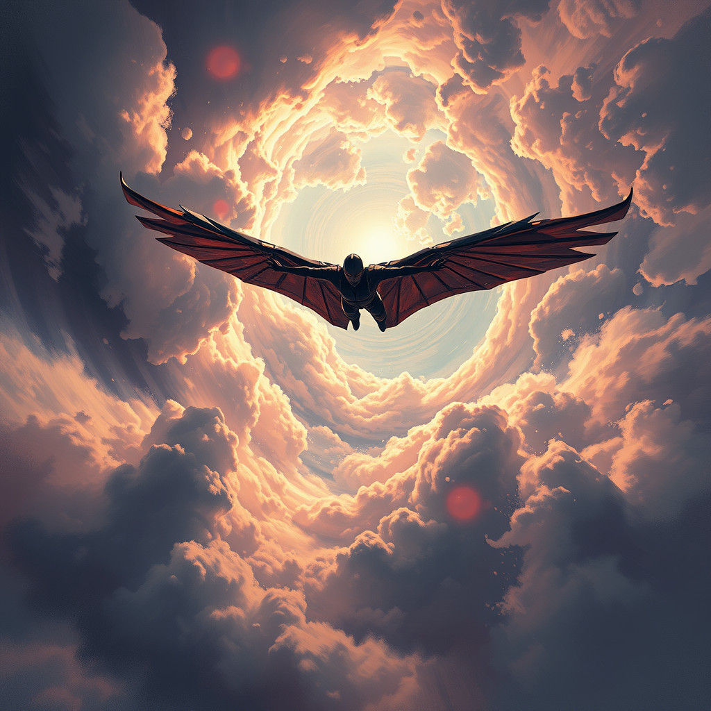 A dynamic image of a person wingsuit flying through a vortex of clouds. Dynamic lighting illuminates the scene with bold colors in a surreal style, like gouache on matte.