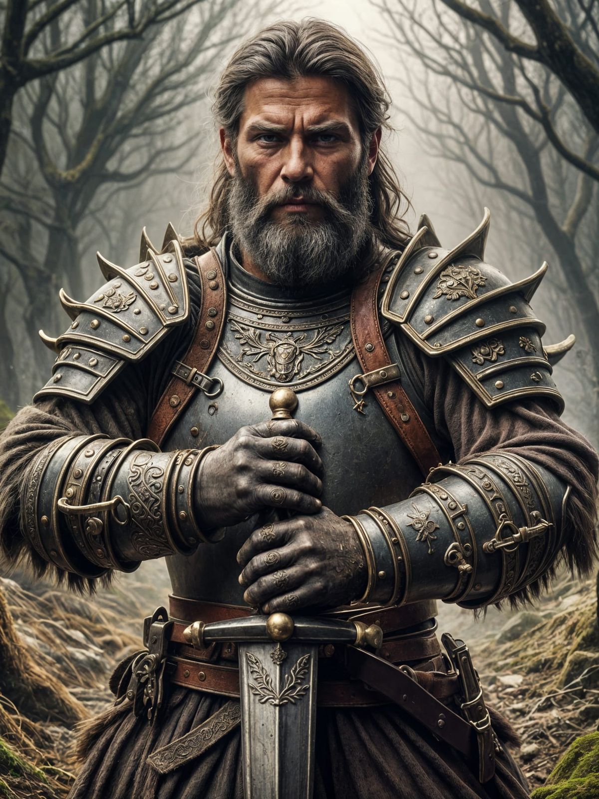 This image depicts a heavily armored knight preparing for combat, adorned with intricate breastplate details and an imposing falchion sword at the ready, showcasing a blend of historical and hyperrealistic artistry.