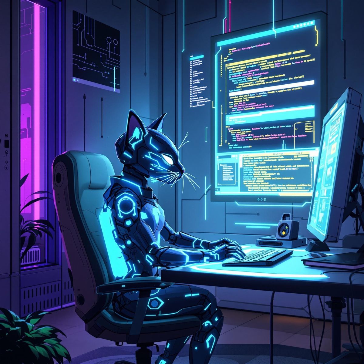 This image shows a neon-blue cartoon cat with cybernetic enhancements coding at a holographic workstation in a minimalist apartment. The artwork has a cyberpunk aesthetic.