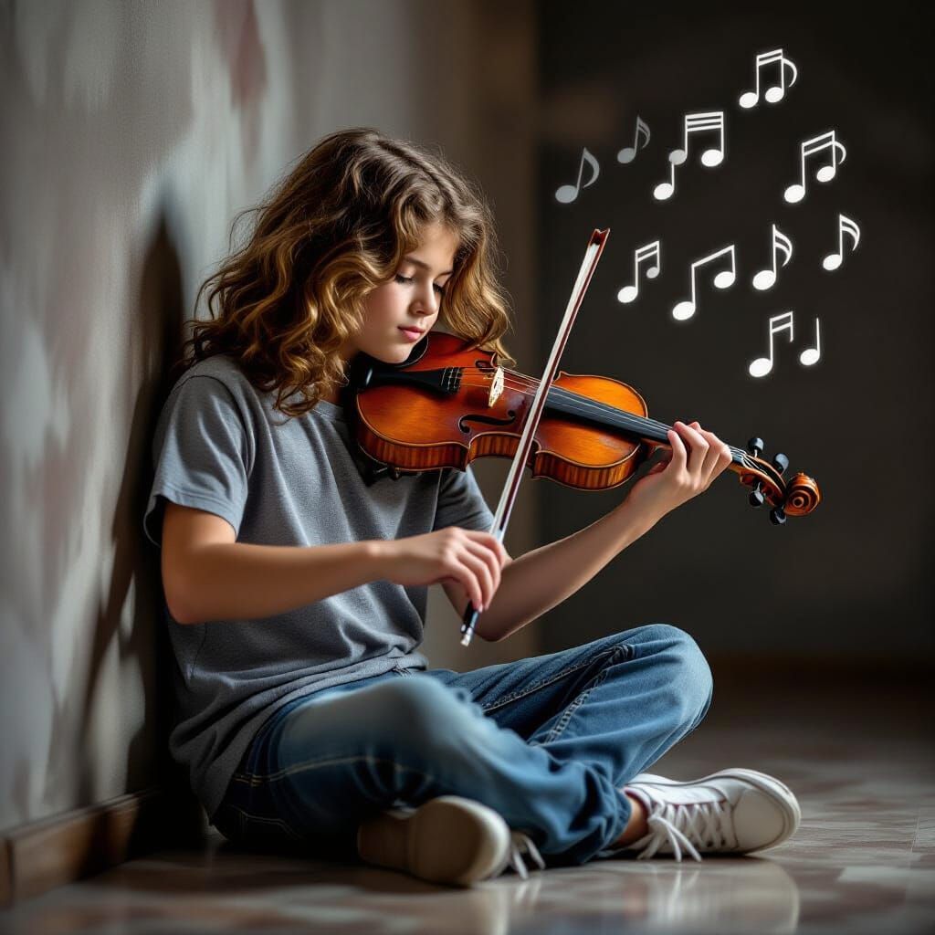 This image shows a 15-year-old boy with long, curly brown hair sitting alone in a dark room, playing the violin. Notes float in the air in this hyperrealistic, high-contrast image.