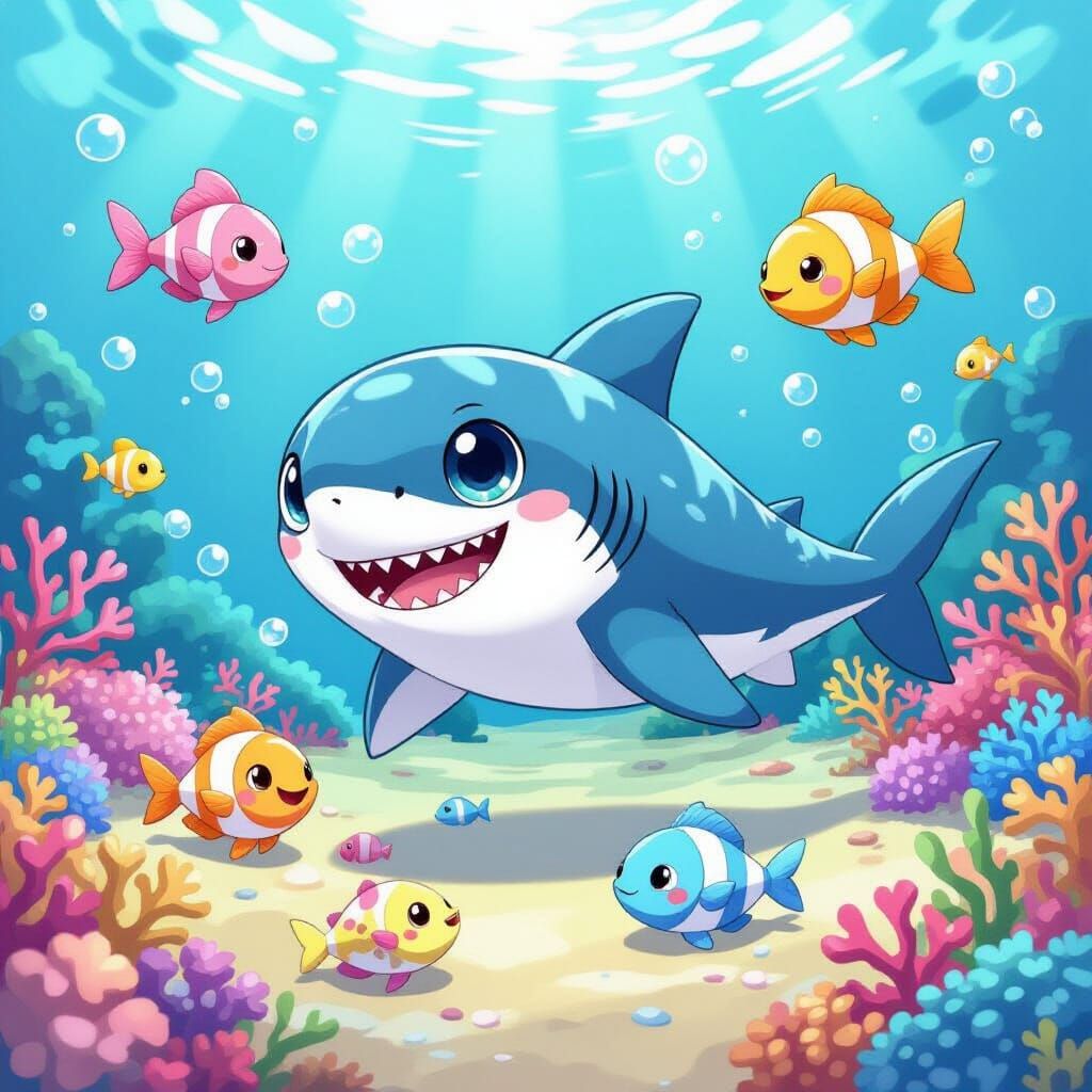 This image shows a cute shark playing hide and seek with fish in a cozy ocean. It features vibrant pastel colors and soft textures, rendered in a dynamic anime key visual style.