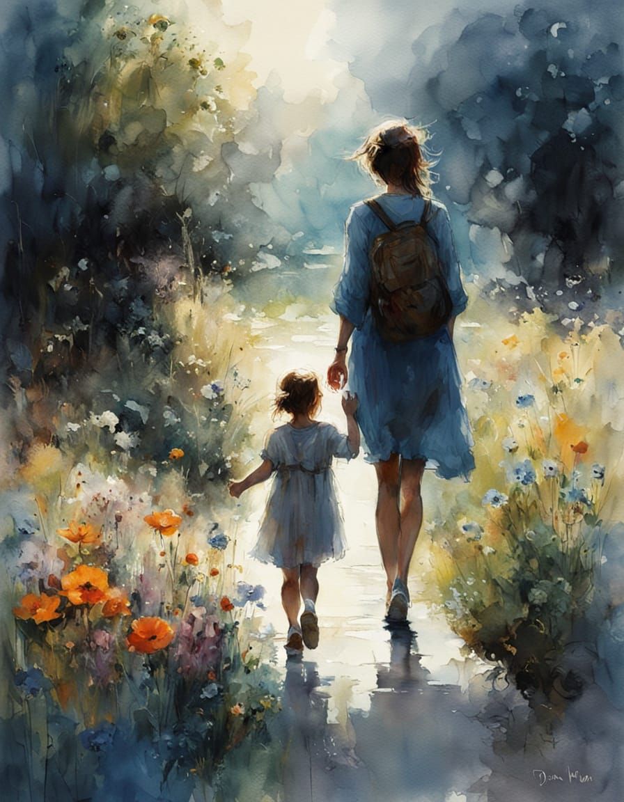 This stunning watercolor painting captures the warmth of a mother's love, surrounded by colorful flowers and a serene meadow, with a cat by her side, bathed in soft sunlight and set against a brilliant blue sky.