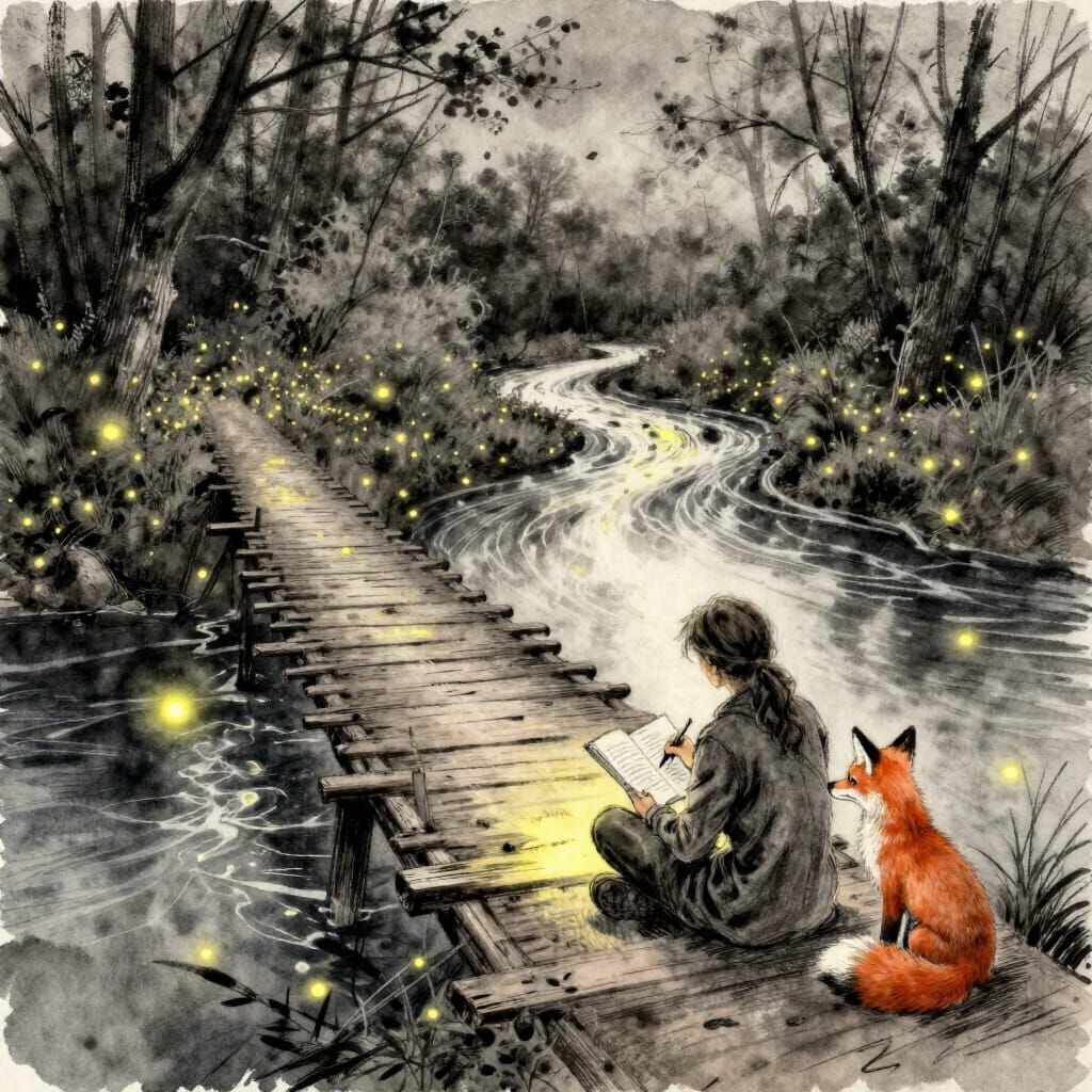 This image depicts a wooden bridge over a luminous river teeming with fireflies. A traveler sketches the enchanting scene, accompanied by a fox, rendered in a charcoal-lined watercolor aesthetic with glowing highlights.