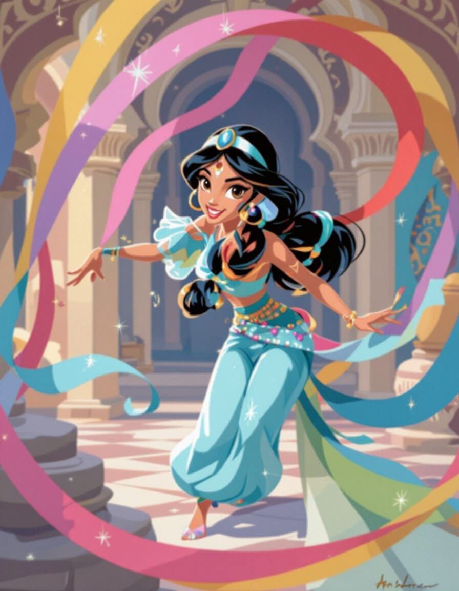 This image shows Princess Jasmine dancing with colorful ribbons. The artwork is evocative of acrylic paintings with realistic fantasy elements.