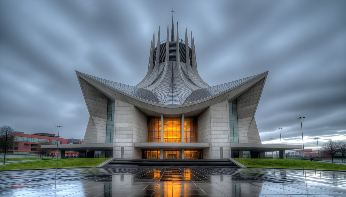 A hyperrealistic, HDR photograph of Liverpool's Catholic Cathedral, known locally as Paddy's Wigwam. The image features intricate details, sharp focus, and moody, cinematic lighting.