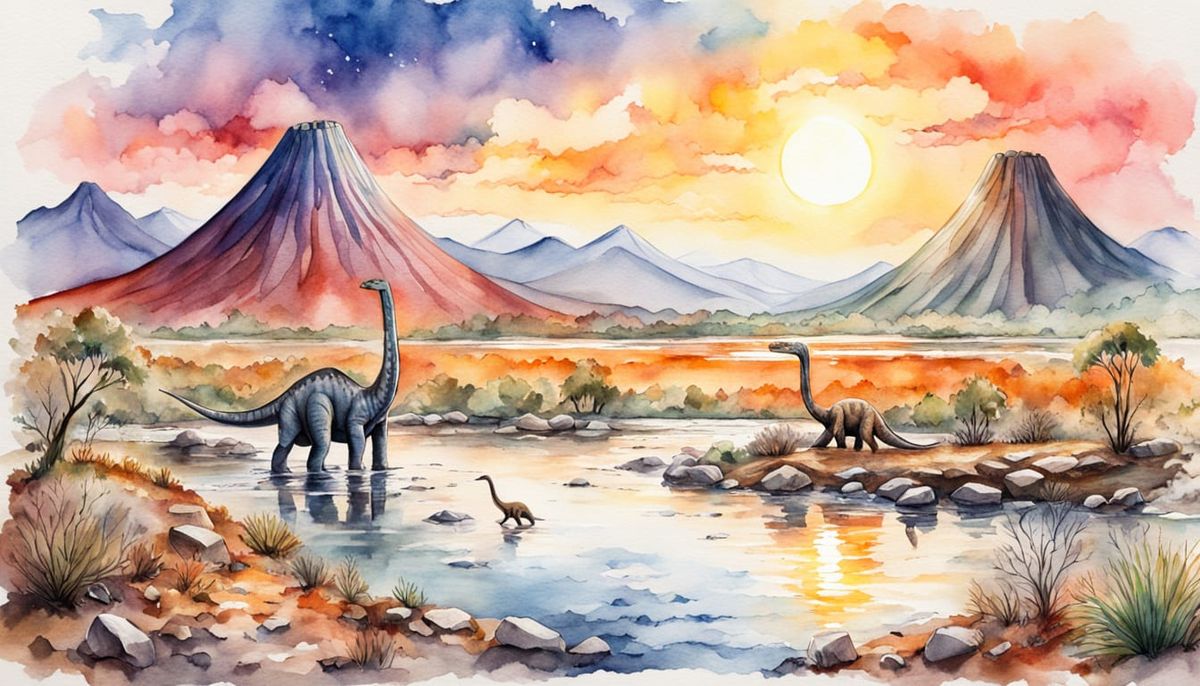 A vivid image of a Brachiosaurus nest amidst a Jurassic landscape with one egg hatching. The scene includes a Pterodactyl, volcano, and river, rendered as an ink and watercolor painting.