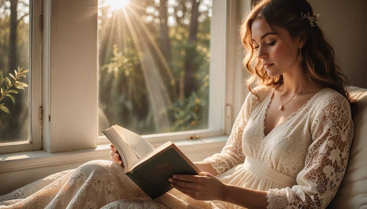 This image shows a woman reading by a window in golden light. The scene evokes a romantic and serene atmosphere, capturing the dreamy, peaceful moment in a painterly style.