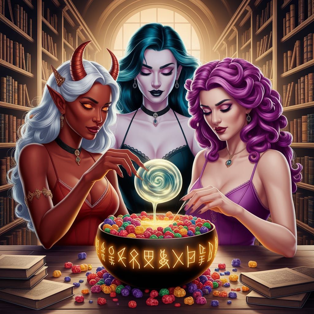 This digital art features three powerful goddesses, a demon, vampire, and Medusa, playfully adding glowing poison to a rune-adorned candy bowl in an ancient library setting. The scene blends enchanting mystery with subtle danger.